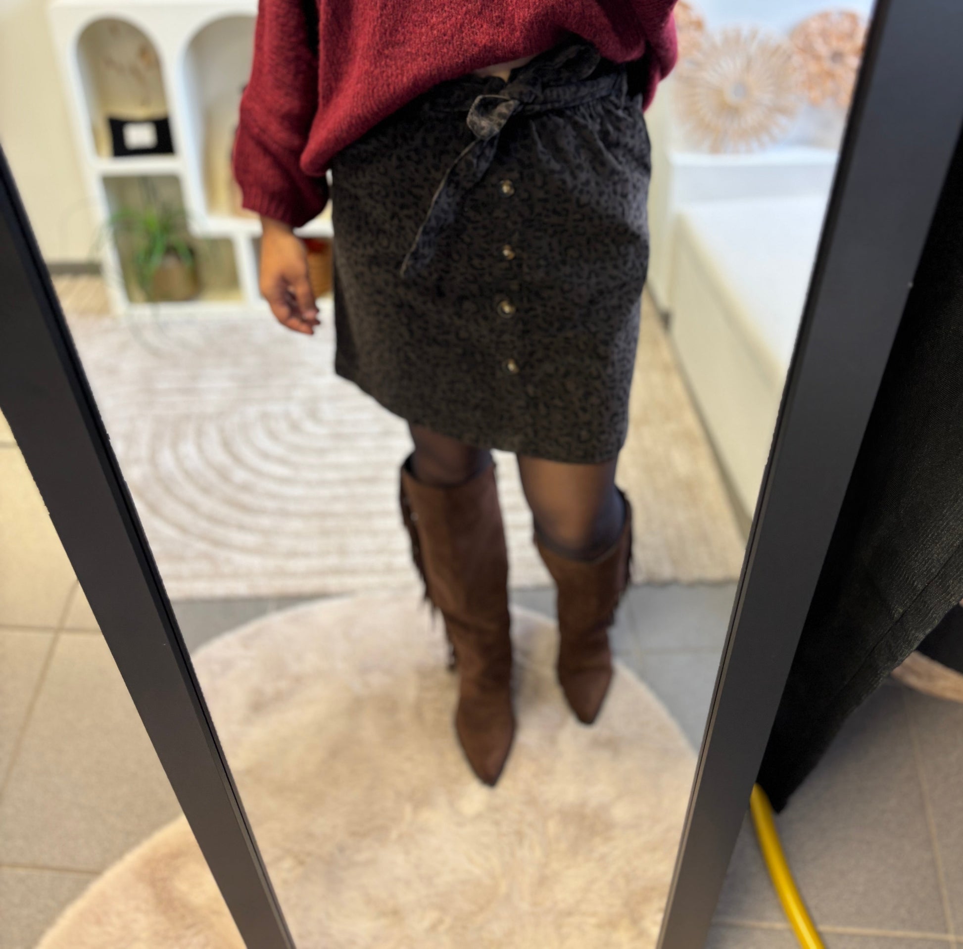 Cette jupe courte à imprimé léopard revisité mise sur le confort et la féminité.